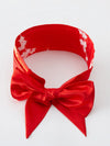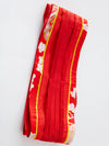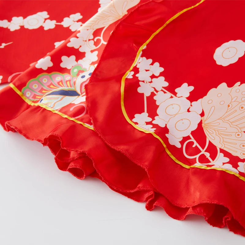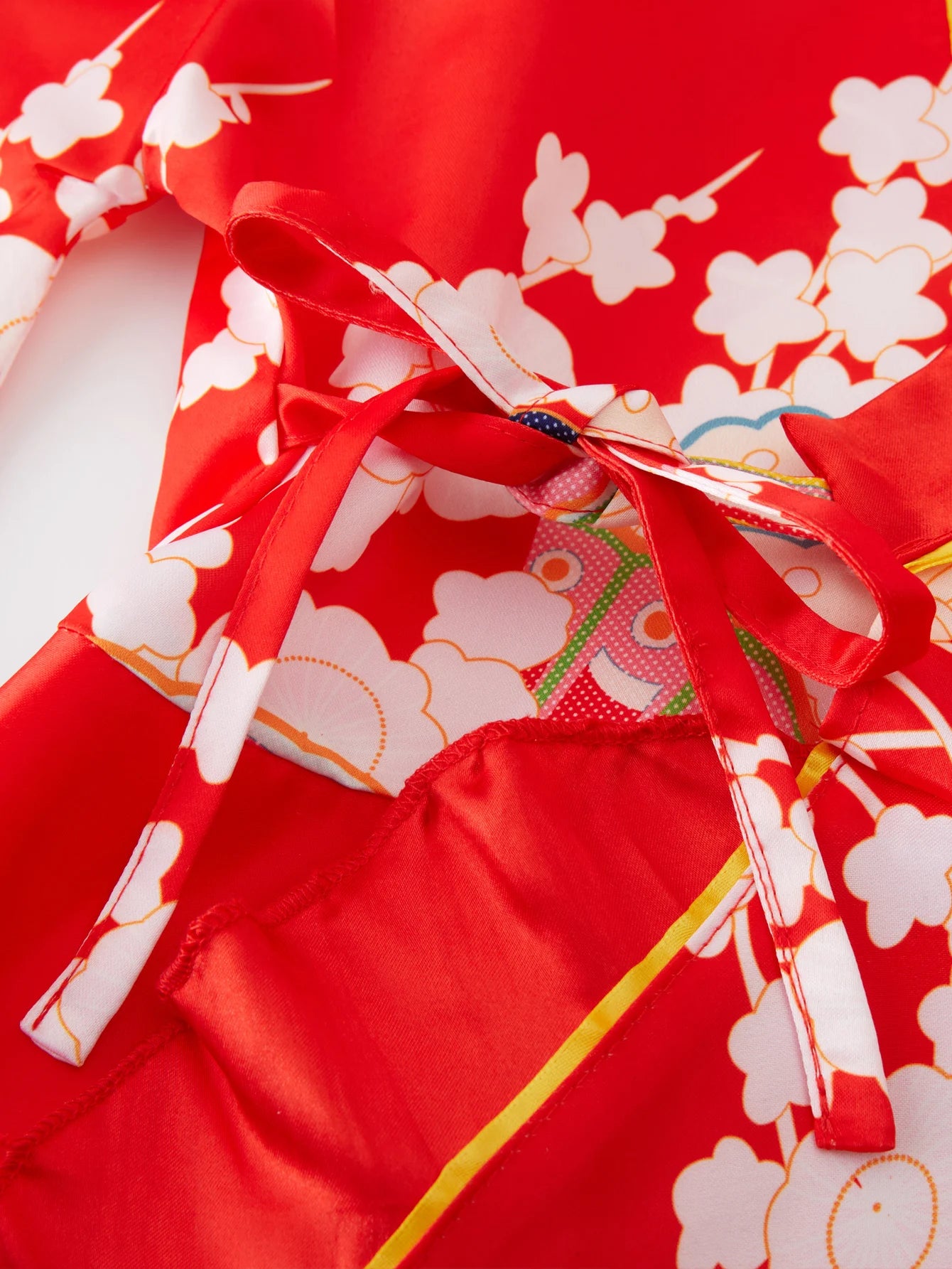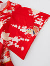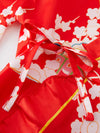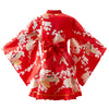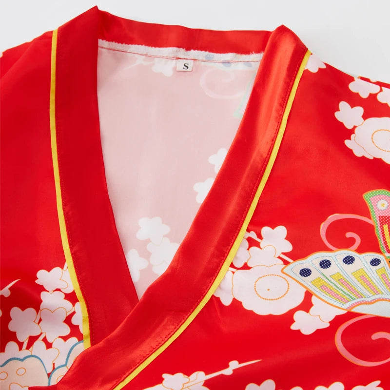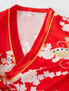 - Kimono court en satin rouge à motifs traditionnels