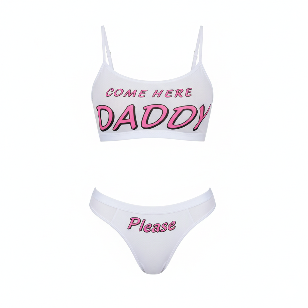 - Impressions : “COME HERE DADDY” sur le top, “Please” sur la culotte